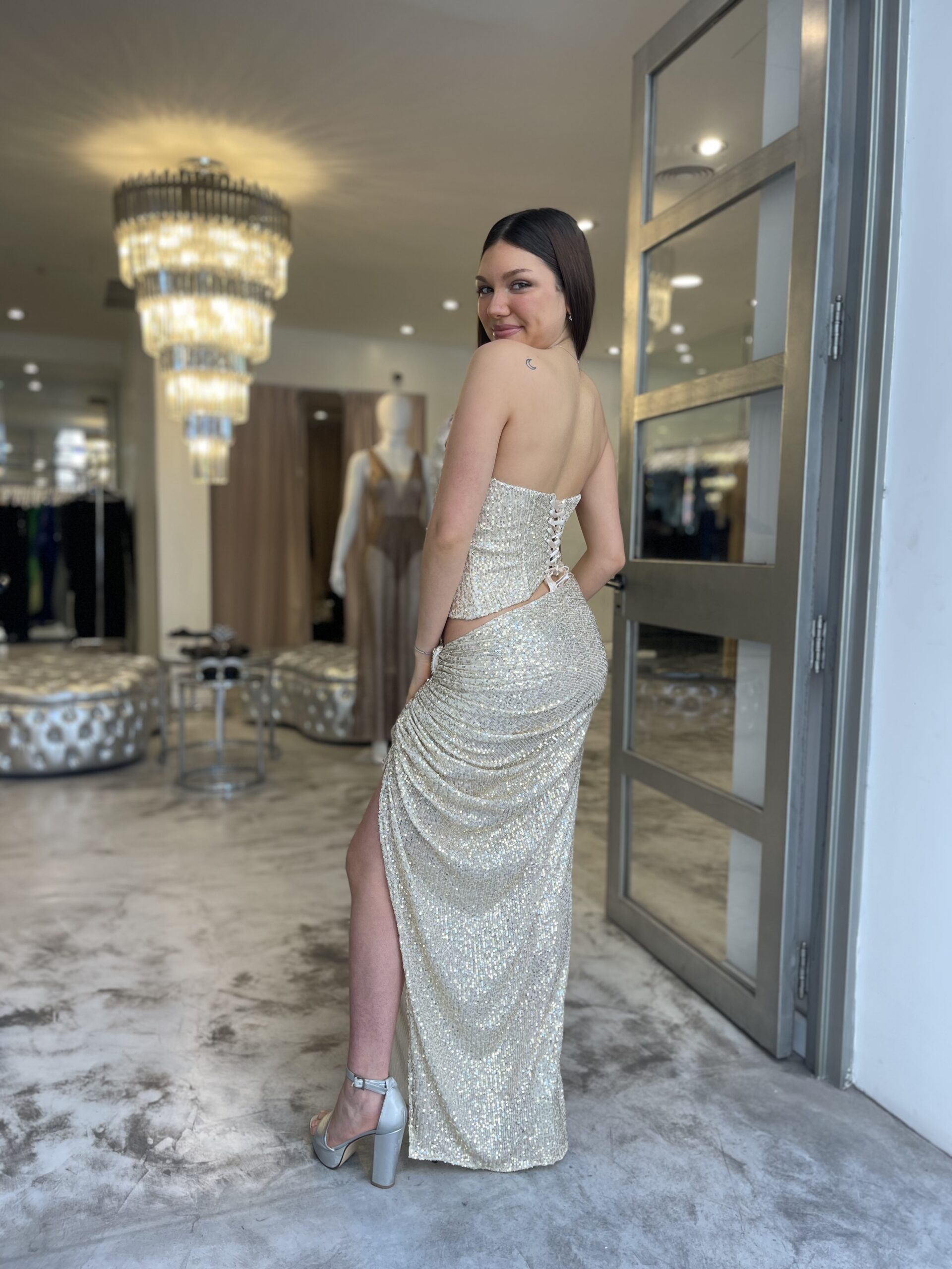 corset corazón realizado en paillette color dorado con falda drapeada a un costado y sutil tajo a una pierna