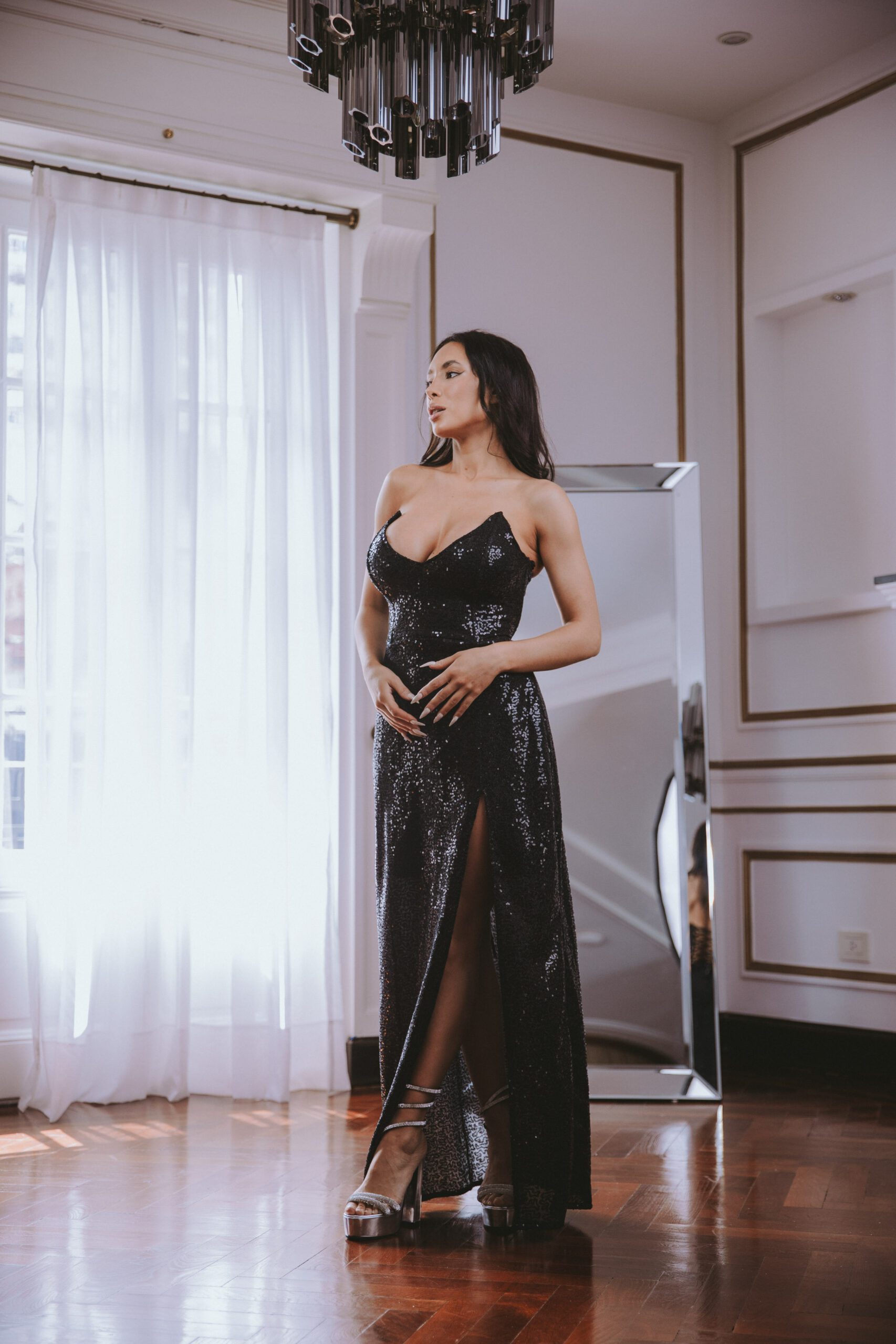 vestido Corset con picos, falda al cuerpo, con tajo a una pierna, realizado en paillette negro
