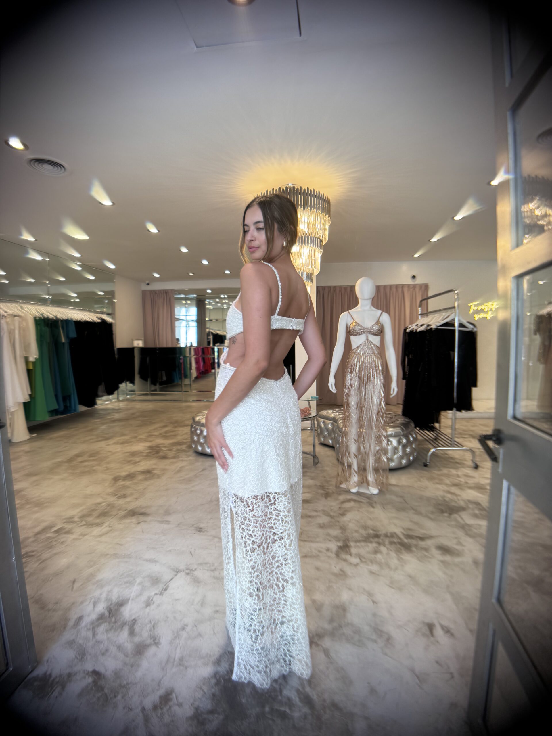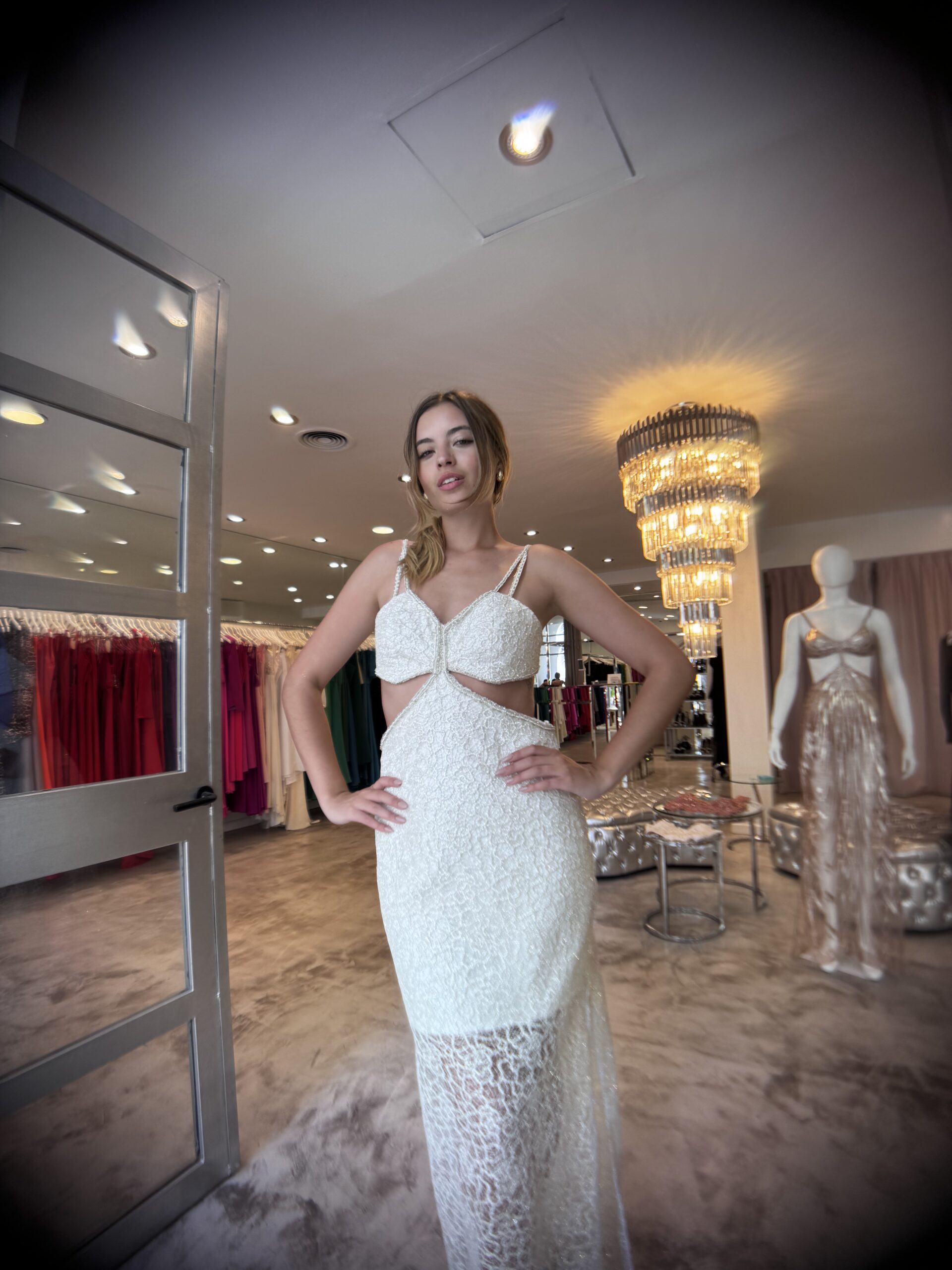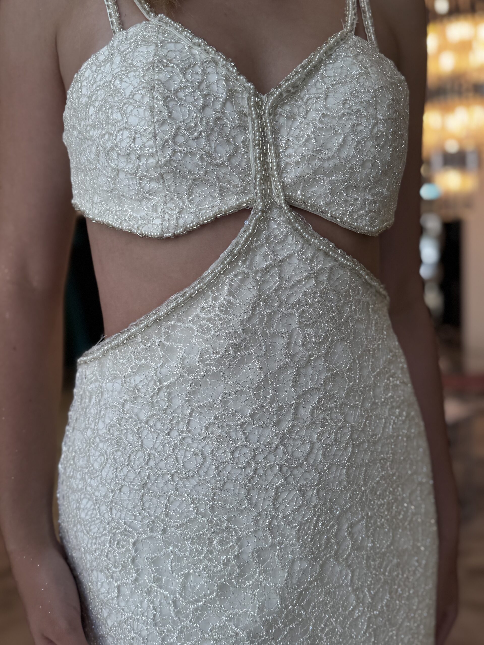 vestido con recortes escote corazón, falda al cuerpo, realizado en guipure con bordado en tonos plata.