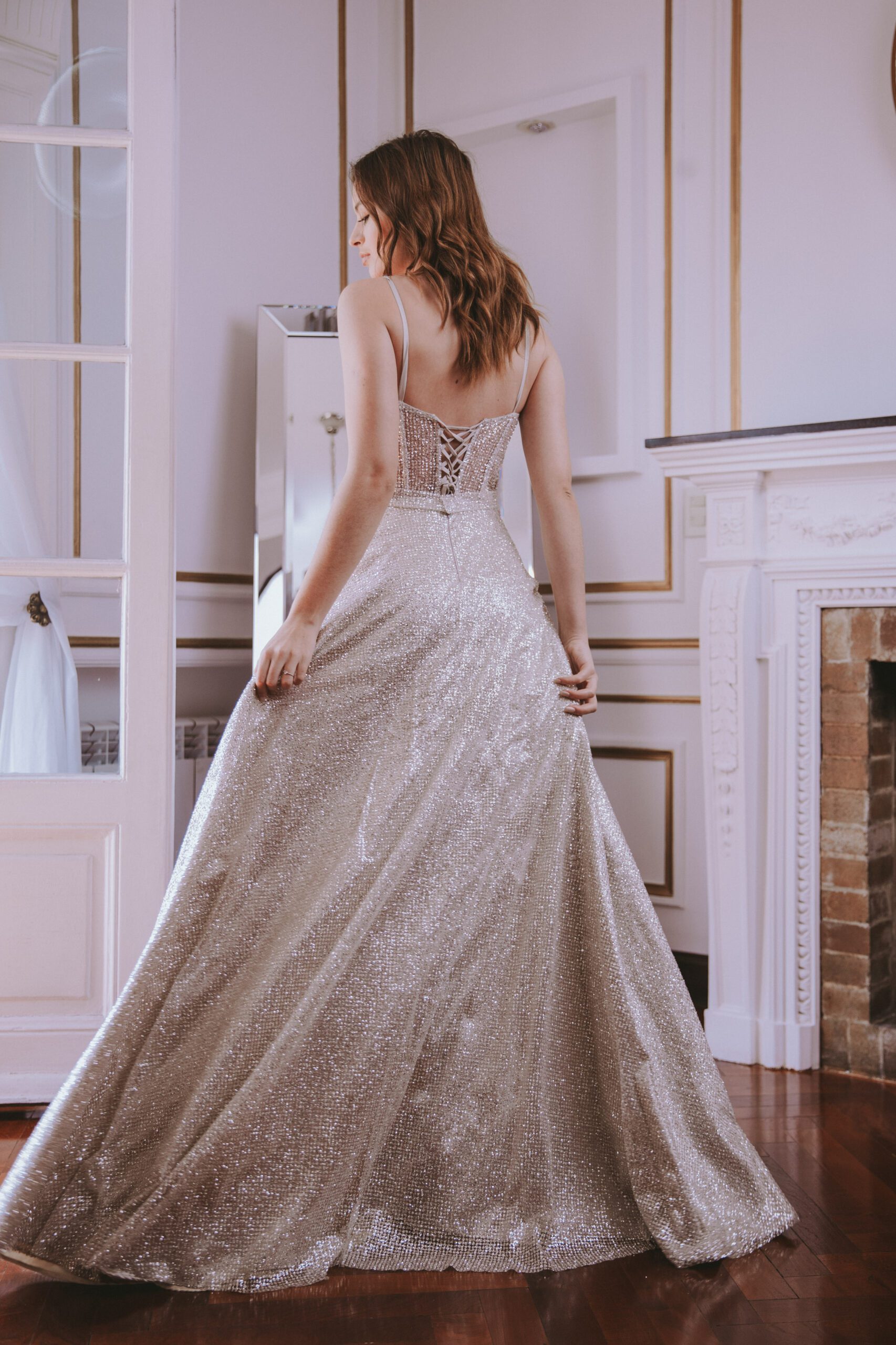 vestido bustier con ballenas con falda plato con varias capas de tul realizado en tul de glitter plata
