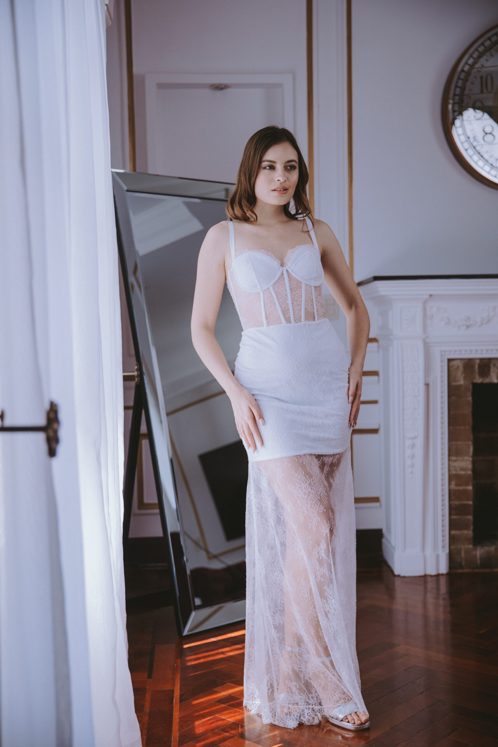 vestido bustier con ballenas forradas, falda sirena realizado en tul chantilly color blanco