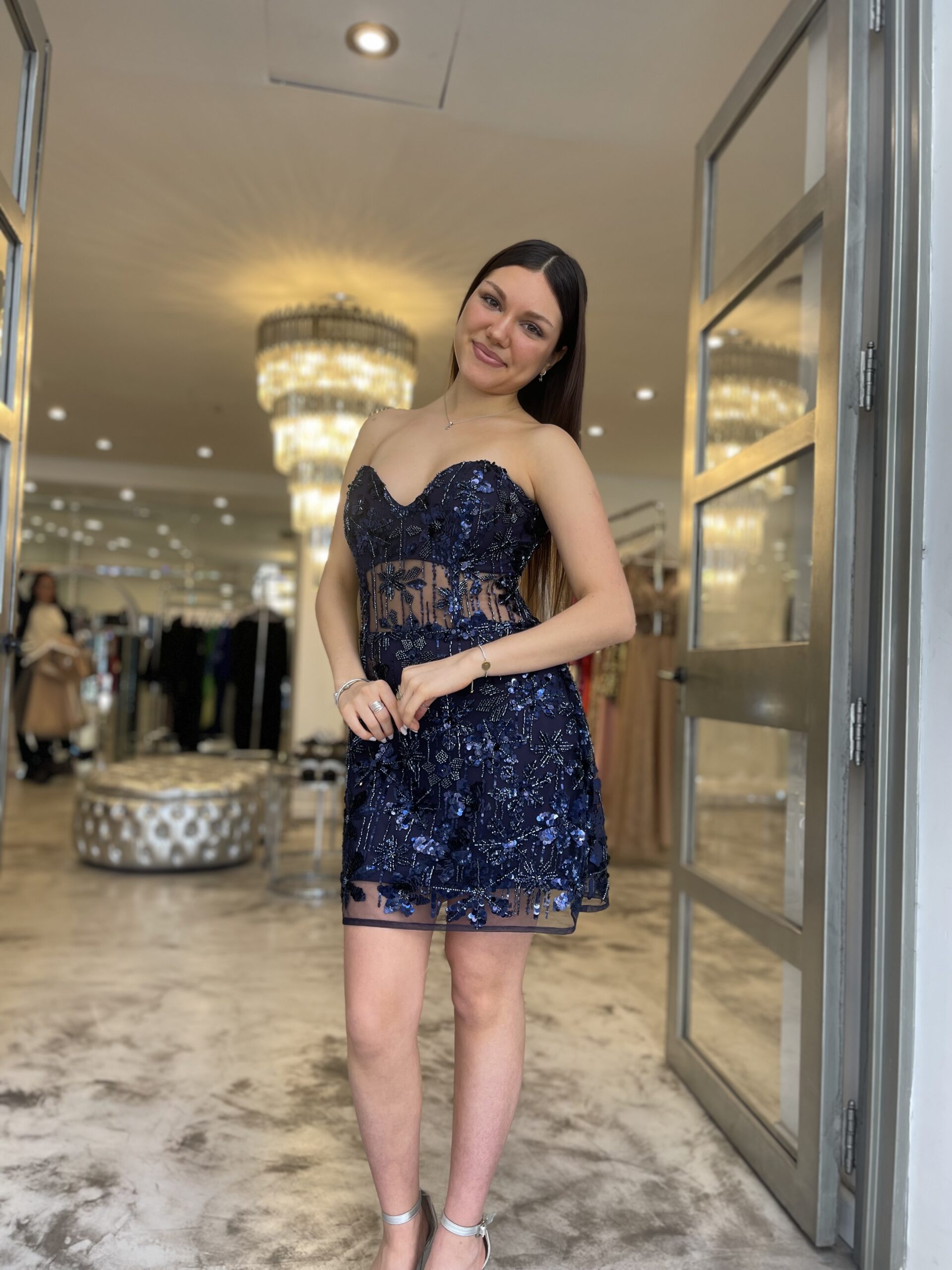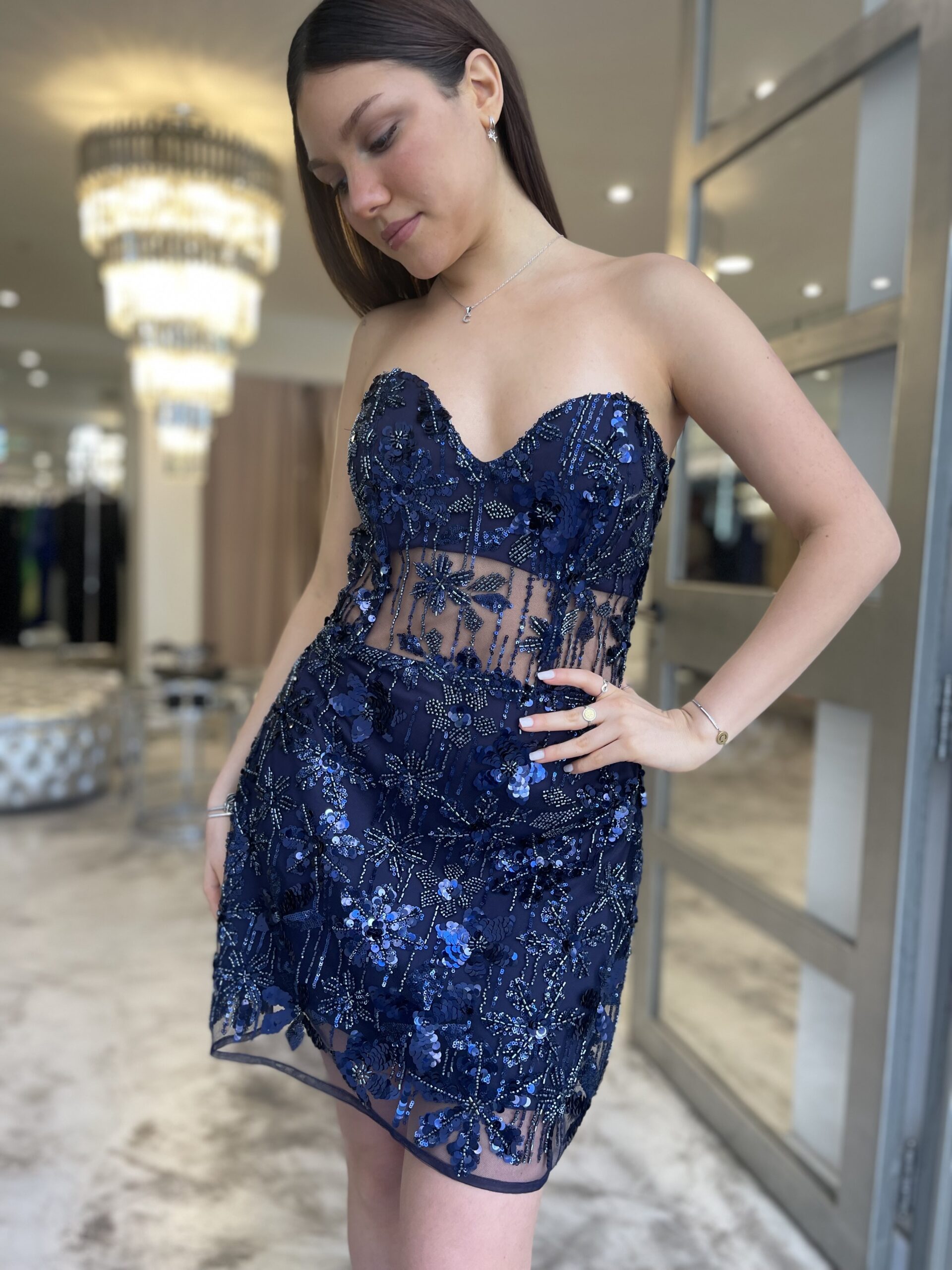 vestido corto escote corazón con transparencias íntegramente bordado a mano con pedrería y sutiles flores al tono