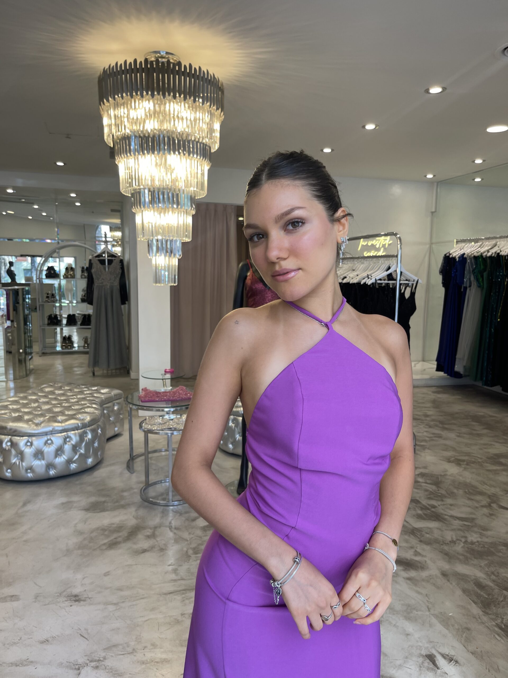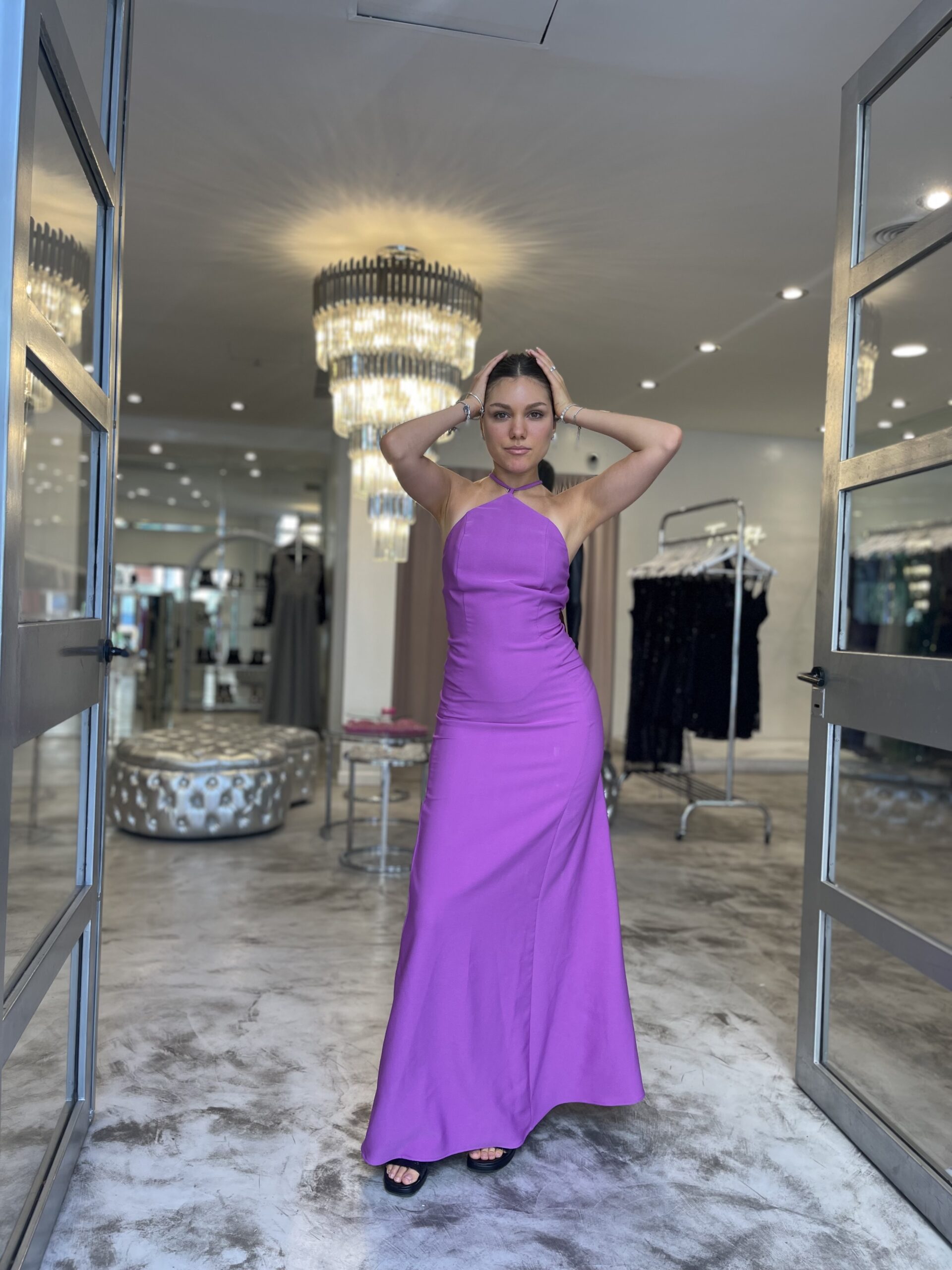vestido escote halter, falda sirena realizado en crepe de seda color magenta