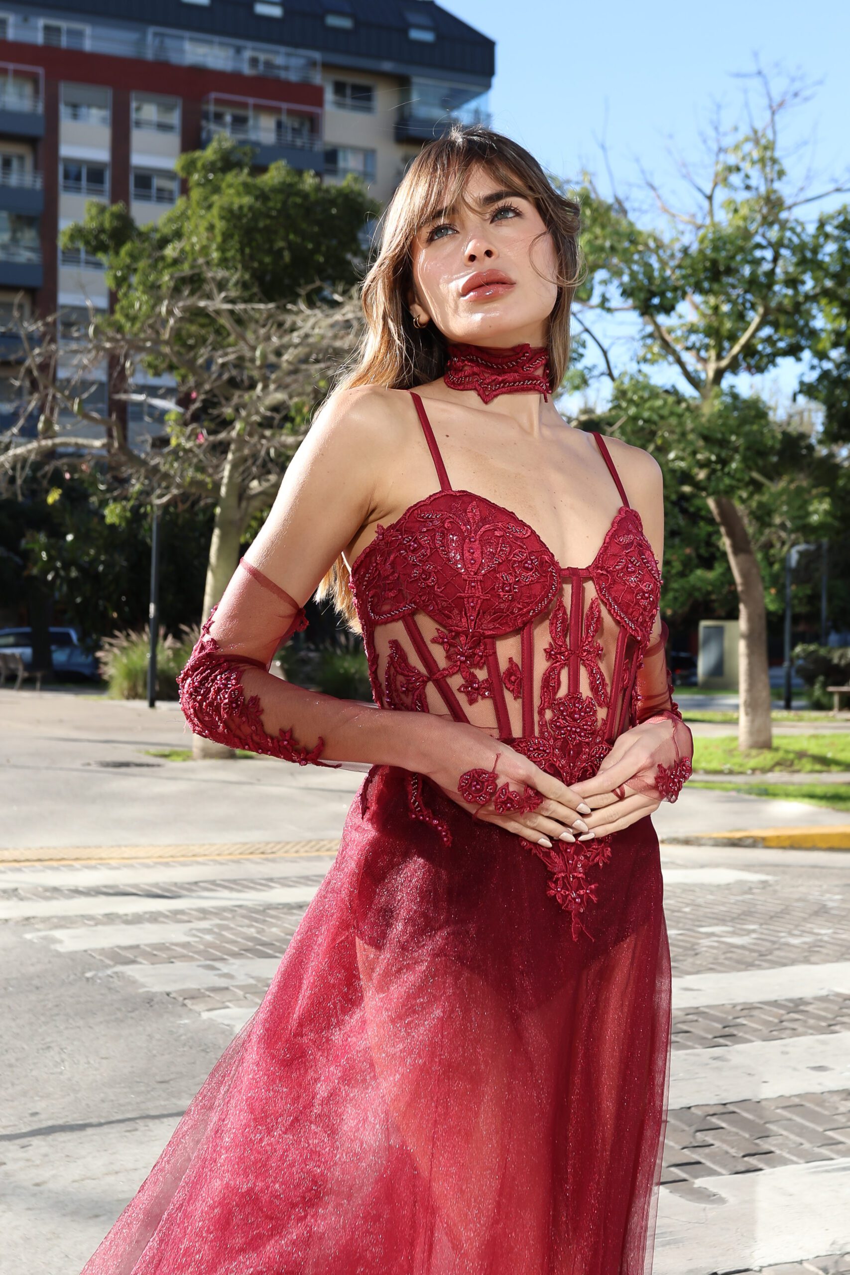 vestido bustier bordado a mano con tul de piedras con falda plato con capas de tul en tono borgoña